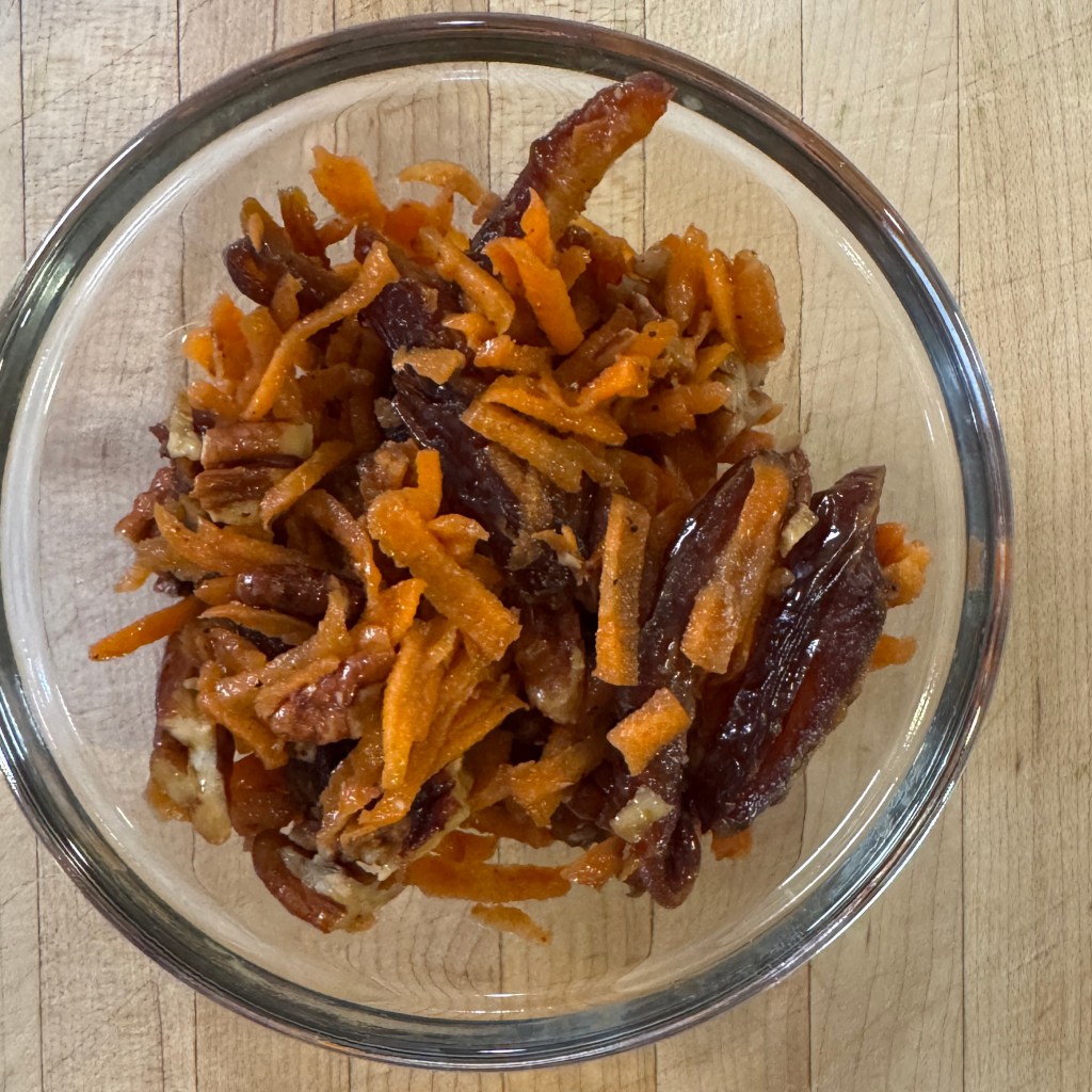 Features shredded carrots, dates, toasted pecans, pomegranate molasses, and lemon.