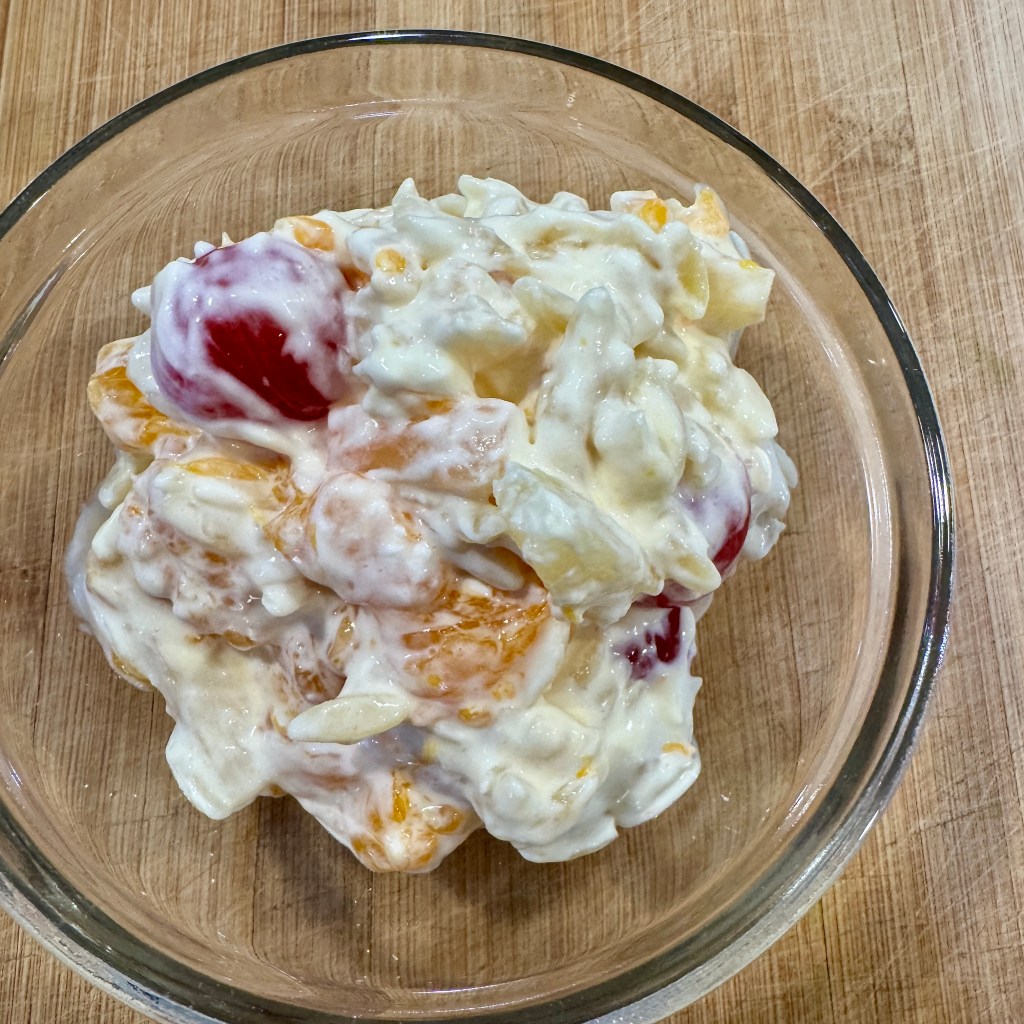 Features orzo pasta, pineapple, maraschino cherries, mandarin oranges, and a whipped topping.