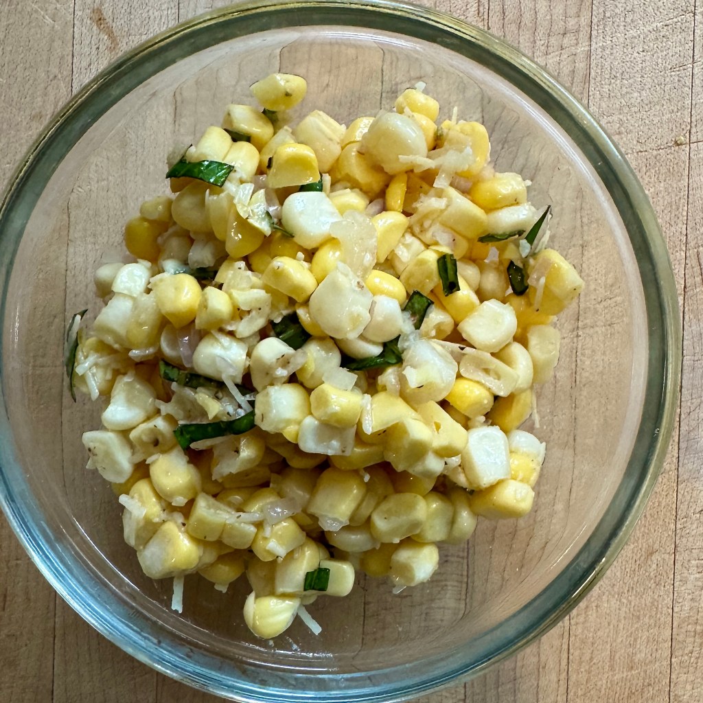 Features fresh corn, Parmesan cheese, shallot, and basil.