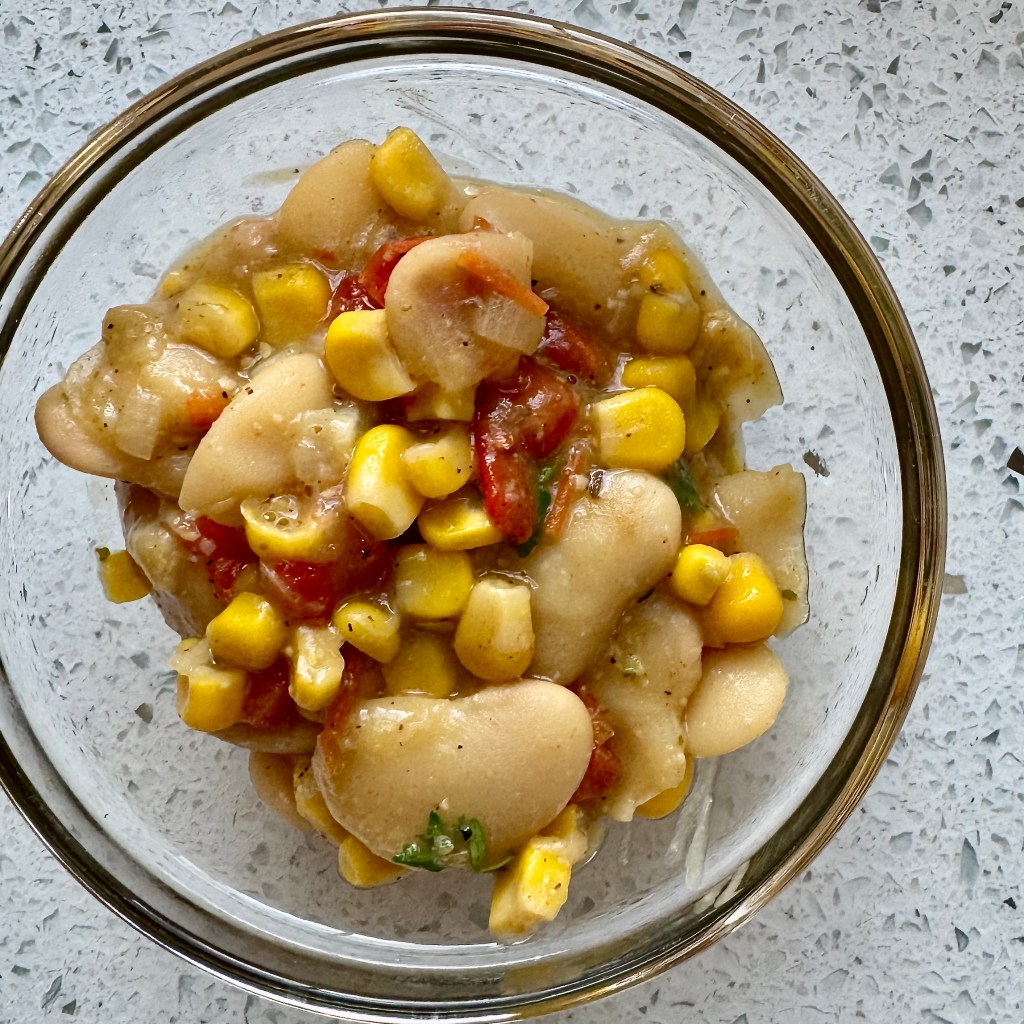 Features fresh corn, butter (lima) beans, red bell pepper, garlic, and pesto.