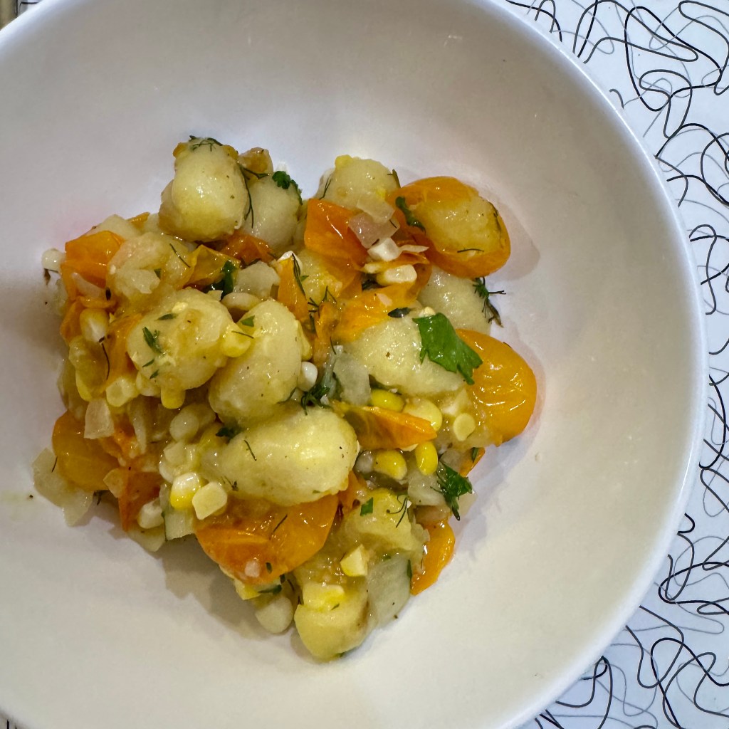 Features cherry tomatoes, fresh corn, packaged gnocchi, garlic, onion, and fresh herbs.
