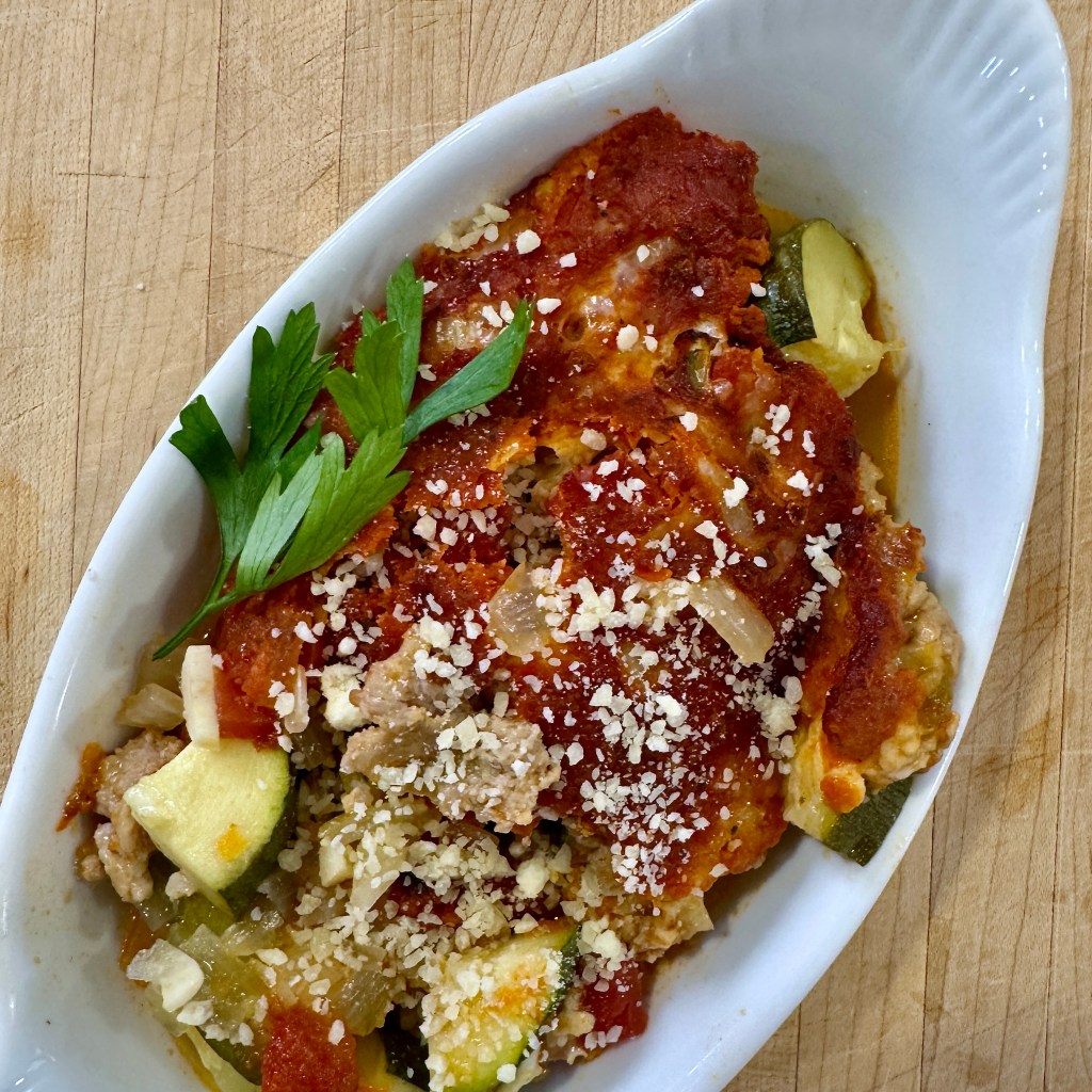 This baked dish is saucy, cheesy, and uses lots of lovely summer zucchini, as well as a few pantry staples.