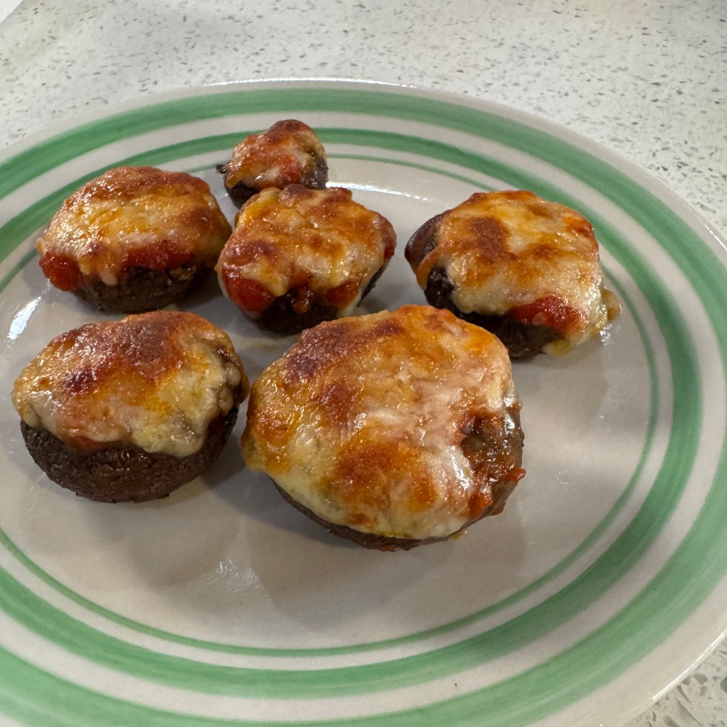 Simple ‘shrooom caps filled with sauce and cheese.