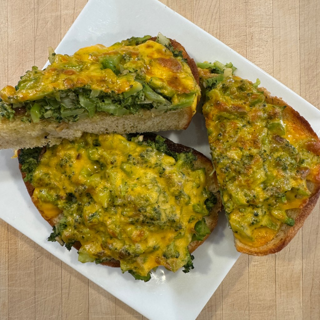Features French Bread, broccoli, onion soup packets, and cheddar cheese.